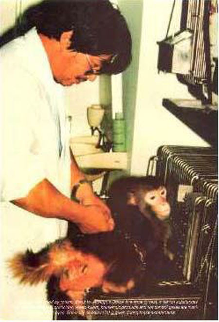 揭秘 :惨不忍睹的 动物实验 旧照片(图) 被锁链链住的大猩猩,即将被用来做德来塞测试